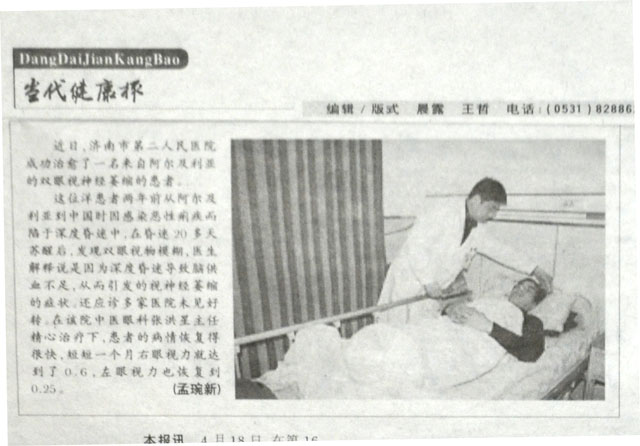 近日,济南眼科医院中医眼科成功治愈了一名来自阿尔及利亚的外籍患者 。尽管两年间的求医经历可谓“铁鞋踏破”,辛劳而费周折,但这位双眼视神经萎缩的外籍患者最终在我院中医眼科找到了光明的希望。经过短短一个月的治疗,患者的双眼视力大幅提升,右眼视力更是恢复到了0.6。据了解,这位洋患者两年前从阿尔及利亚到中国时因感染恶性痢疾而陷于深度昏迷中,在昏迷20多天苏醒后,发现双眼视物模糊,医生解释说是因为深度昏迷导致脑供血不足,从而引发的视神经萎缩的症状。在此后的两年间,这位患者辗转于国内外各大医院之间,地方跑了不少,名医拜访了很多,但病情却没有得到根本好转。就在他濒临绝望的时候,福建的一位医生介绍他到我院试试中医治疗,他报着最后一丝希望来到我院,在中医眼科张洪星主任手下开始了针灸加中药的中医疗法。